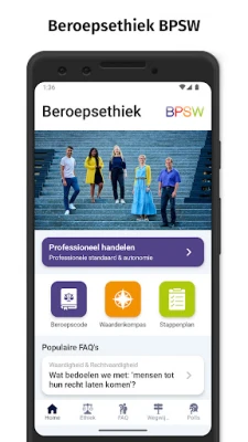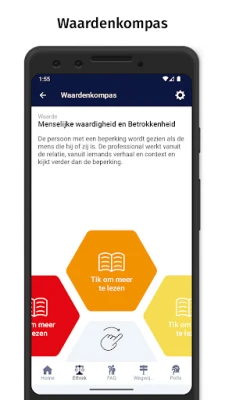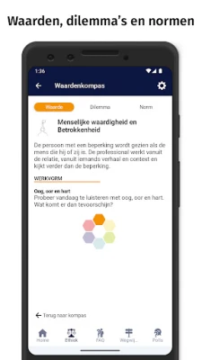 Ontdek de kernwaarden, normen en begrippen van de beroepscode in deze app. Het onderdeel Ethiek bevat het waardenkompas voor de gehandicaptenzorg, een laagdrempelige tool die waardengericht denken en doen versterkt in de dagelijkse praktijk.