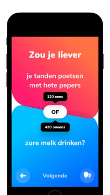 Duik in de fascinerende wereld van Dilemmaly, de ultieme app die elke bijeenkomst, groot of klein, omtovert tot een bruisend debat vol verrassende onthullingen. Of je nu alleen speelt, één-op-één een strijd aangaat, of een hele groep aan het denken zet, de keuze is aan jou. Selecteer een themadeck, lees een prikkelende 'Zou je liever'-uitspraak hardop voor, en maak jouw gewaagde beslissing. Het meest intrigerende? Je ziet direct hoe jouw mening zich verhoudt tot die van spelers wereldwijd. Geef de telefoon door en laat het spel zijn gang gaan, met regels die jij en je medespelers bepalen.