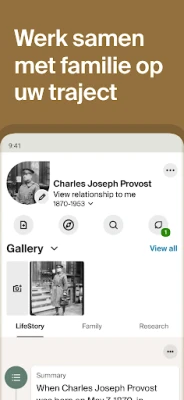 Samenwerken met familie en vrienden aan deze reis is moeiteloos dankzij de intuïtieve, moderne interface. Zelfs zonder abonnement kunt u al een complete stamboom opbouwen, meer dan 1,1 miljard volkstellingsbestanden doorzoeken en gepersonaliseerde hints ontvangen. Upload of scan eenvoudig uw eigen familiefoto's en ontvang berichten van andere Ancestry-leden. Voor een ongeëvenaarde verkenning, biedt een optioneel abonnement of gratis proefabonnement toegang tot ruim 30 miljard historische documenten, zodat u nog meer voorouders, foto's en verhalen kunt ontdekken. Ancestry maakt het makkelijker dan ooit om uw verleden te omarmen en te delen.