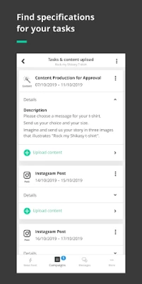 Nadat je jouw unieke content hebt gecreëerd, is het indienen ervan een fluitje van een cent. Lever simpelweg de URL's aan van de posts die je voor het merk hebt gemaakt, en de Collabary App zorgt voor de rest. Mis nooit meer een deadline of een detail, dankzij het overzichtelijke dashboard. Hier zie je al je samenwerkingen op één plek: van de voorstellen die nog wachten op jouw reactie tot de campagnes die actief lopen, en de projecten die succesvol zijn afgerond.
