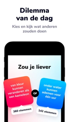 Dilemmaly is de ultieme 'Zou je liever?' app. Geniet met vrienden en familie van duizenden uitdagende en hilarische dilemma's. Vergelijk jouw keuzes met miljoenen spelers. Urenlang interactief plezier gegarandeerd!