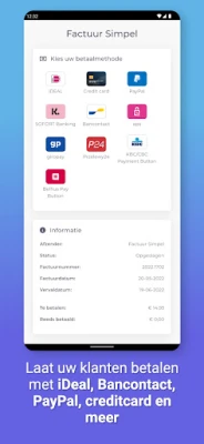Versnel de afhandeling van uw facturen en transformeer de betaalervaring voor uw klanten. Met Factuur Simpel biedt u hen een naadloze en vertrouwde manier om te voldoen aan hun betalingsverplichtingen. Laat trage betalingen tot het verleden behoren door uw cliënten de flexibiliteit te geven van diverse betaalopties. Of het nu gaat om iDeal, Bancontact, PayPal, Creditcard of een van de andere beschikbare methoden, Factuur Simpel zorgt ervoor dat uw klanten moeiteloos en op hun eigen voorwaarden kunnen betalen, wat resulteert in een snellere ontvangst van uw inkomsten.