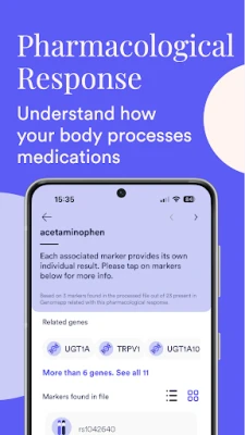 Met Genomapp krijgt u toegang tot een breed scala aan gedetailleerde rapporten. Verken gratis inzichten in gezondheidsrisico's, erfelijke aandoeningen en farmacologische respons om te begrijpen hoe uw lichaam op medicatie kan reageren. Breid uw kennis verder uit met premium rapporten over genetische eigenschappen, observeerbare kenmerken en bloedgroepen. Duik dieper in specifieke gebieden zoals methylatie en veroudering, en ontdek hoe uw genen invloed hebben op uw metabolisme en biologische leeftijd. De applicatie maakt gebruik van een uitgebreide database met meer dan 9.500 aandoeningen, 12.400 genen en 180.000 genetische markers, inclusief cruciale markeringen zoals BRCA, PTEN en P53, gebaseerd op de nieuwste wetenschappelijke inzichten.